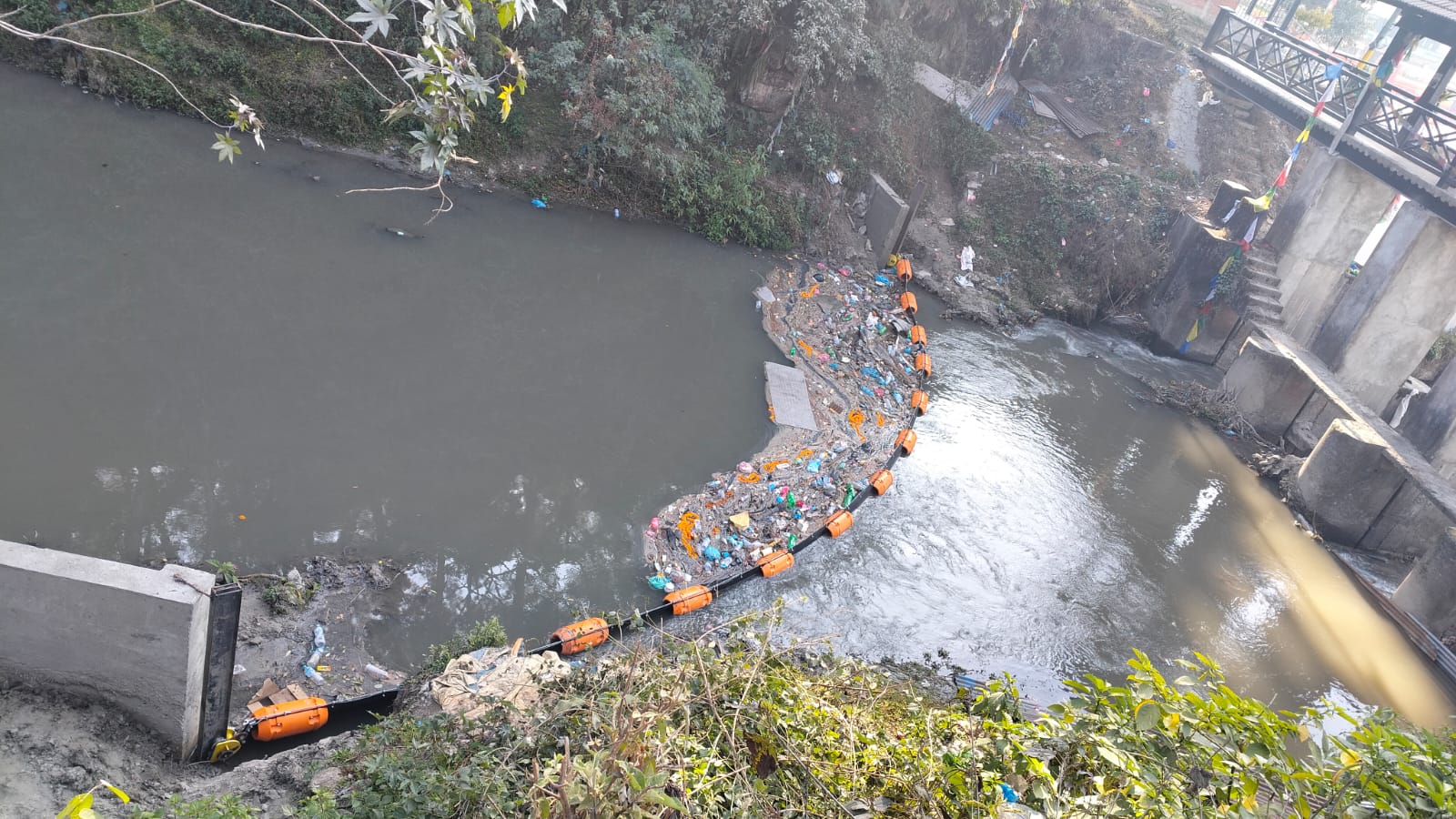 वाग्मती नदी गोकर्णमा राखिएको Trash Barrier बाट संकलन भएको suspended waste को अवस्था, नदी सरसफाई कार्यका लागी विभिन्न ६ स्थानमा राखिएको Trash Barrier बाट खोला सरसफाई कार्य सहज हुँदै ।